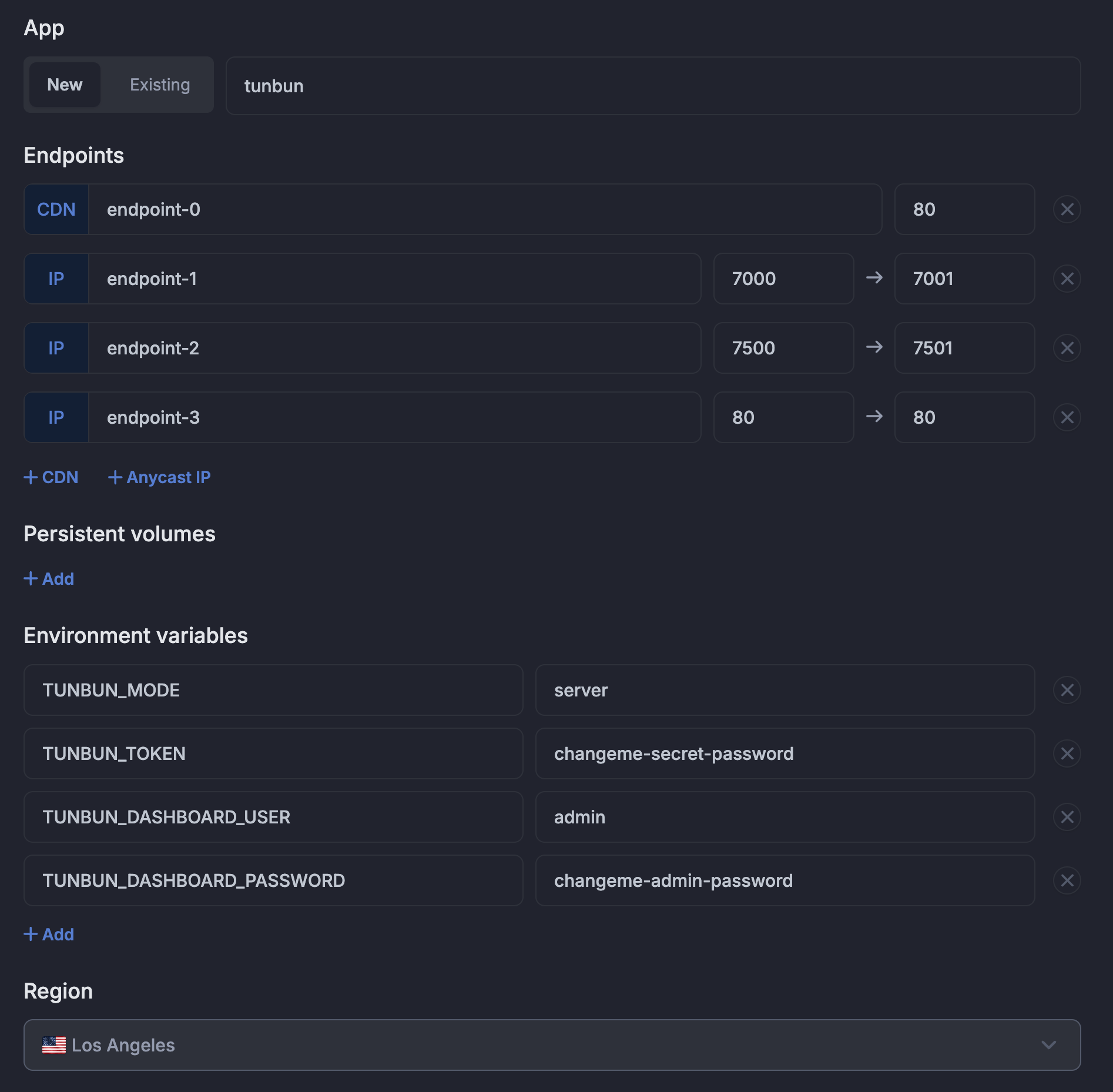 You’ll be prompted to configure the container. Add an additional Anycast IP (endpoint-3, 80 -> 80) and set the minimum environment variables.