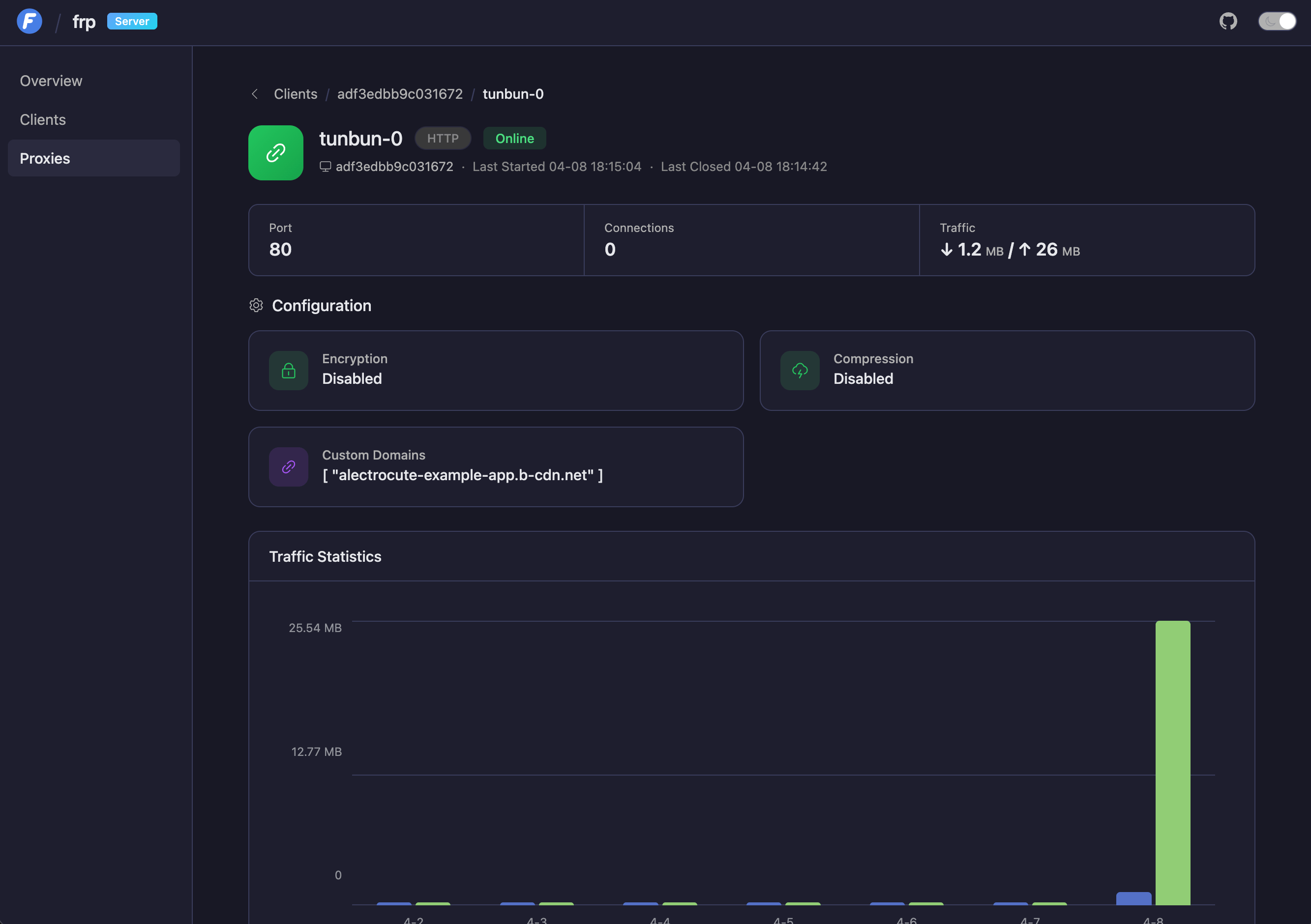 You can check the frp client dashboard at http://localhost:7500. This’ll allow you to see the client’s status, logs, config and even update the config in real-time (with option to persist to a file). All of the functionality of cloudflared and so much more.