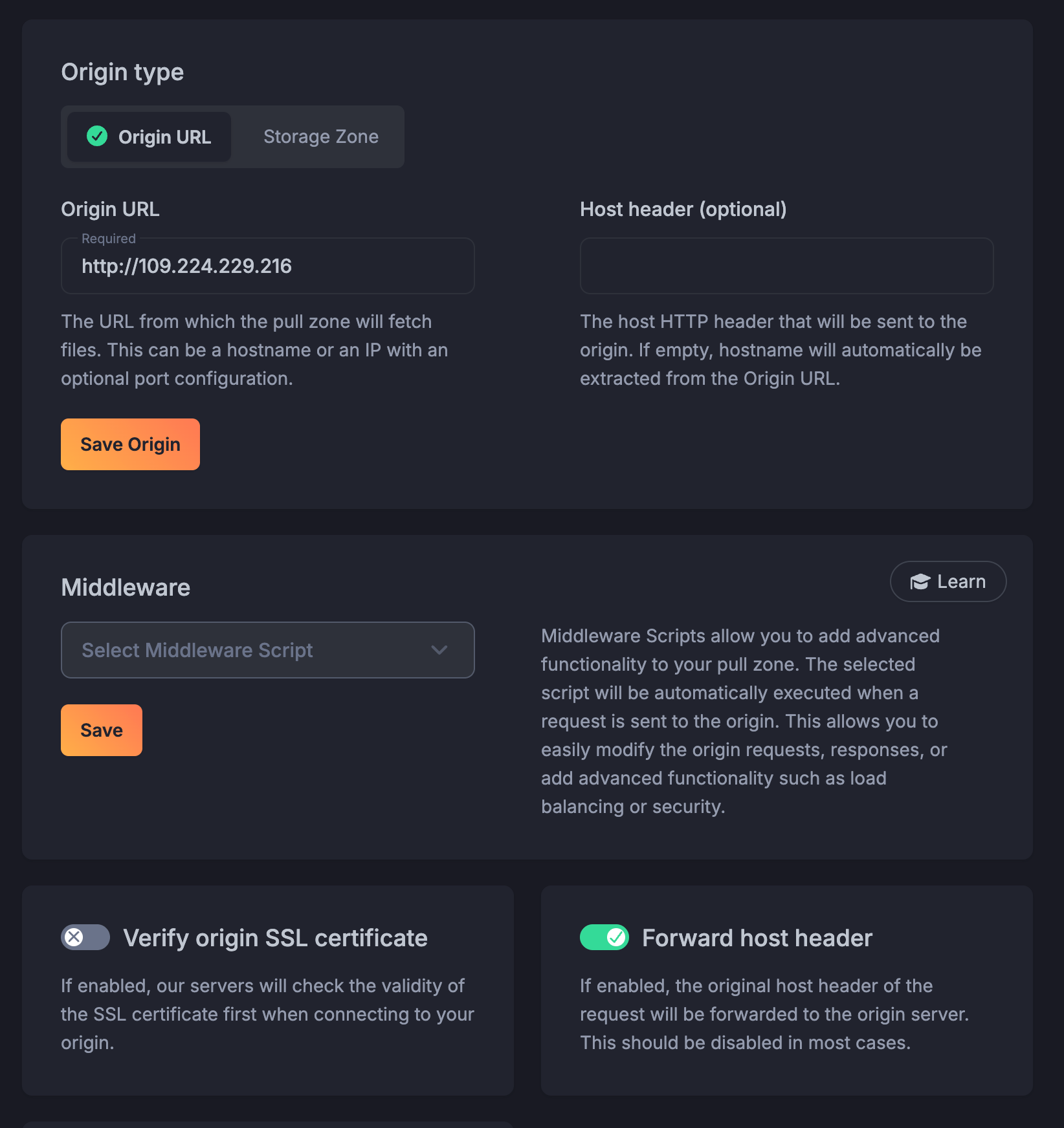 For each app you want to expose, configure a pull zone. So something like my-media-player.b-cdn.net. Point your app’s domain to the 80 -> 80 Anycast IP you noted earlier (not the *.bunny.run or *.b-cdn.net domains), and make sure to enable “Forward host header.”